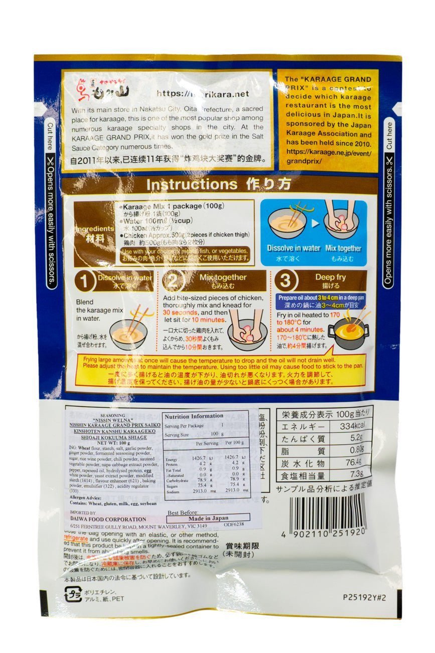 • karaage Mix is a batter with a special salt-based taste, garlic and ginger. The crispy batter and juicy meat are delicious not only freshly fried,but also cold.